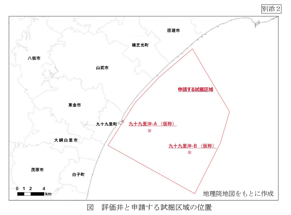 本文書に記されている試掘地点は、九十九里沿岸から沖合7地点を結ぶ線により囲まれる海面および海面下深度150メートルから2,500メートルまでとしており、その中に2つの評価井を掘削する計画となっている。しかし、2つの評価井の位置はおおまかな地図上に示されているのみで具体的な位置は示されておらず、しかも評価井2坑目からは傾斜井を掘削するとあるものの、その傾斜井がどのような位置に予定されているかも示されていない。