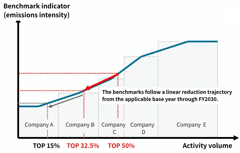 As shown in Table 1, to achieve the emission intensity level of the top performers at the top 15% cumulative activity level, which is prescribed as the original benchmark standard under the Energy Conservation Act, many industries would need to achieve a 20-50% reduction.