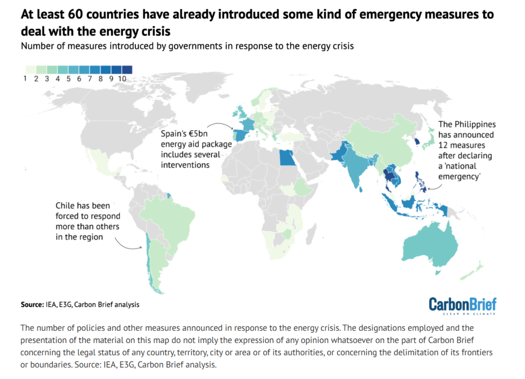 では、これらの国々ではどんな措置が取られているのでしょうか。Carbon Briefの分析によると、燃料価格高騰から国民や企業を守るための取り組み(減税や燃料価格に上限を設ける、補助金など)がこれまでのところ一般的であるということです。ただ、こうした措置は化石燃料システムへの依存を高めるという批判もあります。他に特徴的なのは、自家用車の利用制限といった省エネ政策も20ヵ国以上の国で見られることです。日本、韓国、バングラデシュ、フィリピン、タイ、パキスタン、ドイツ、イタリアの8カ国では石炭火力発電所閉鎖の延期や、石炭火力発電所の稼働率を高めるといった計画が発表されたとしています。これを見ると、化石燃料利用の維持、(特にアジアでの)石炭回帰とも見える動きですが…以下で紹介する通り、その実態は冷静に見る必要がありそうです。